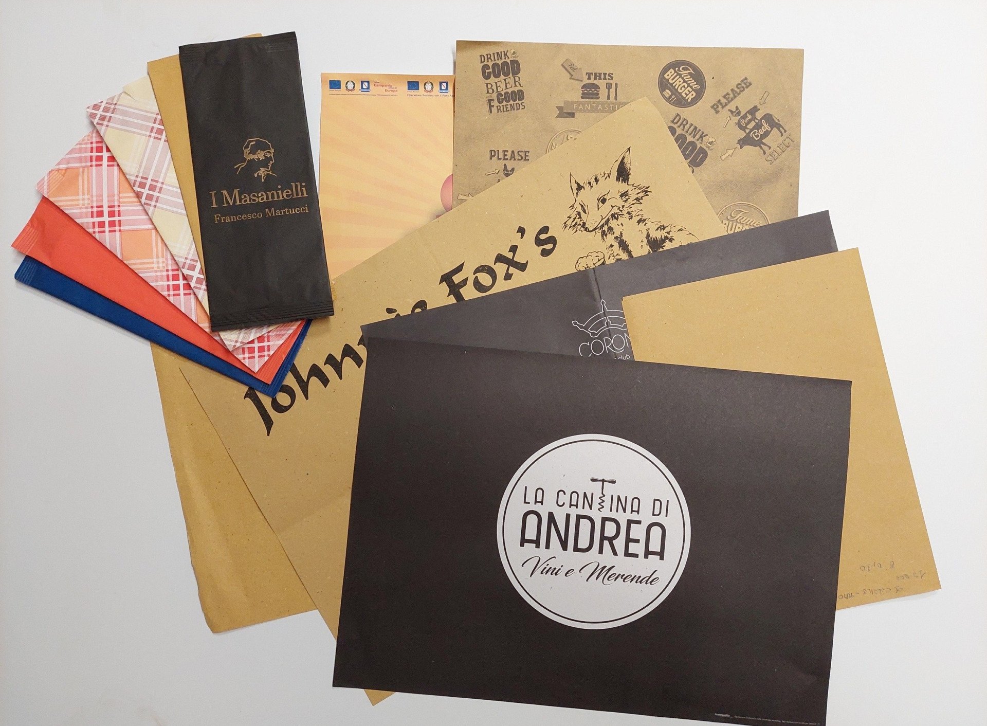 I sacchetti presentano il lato superiore aperto per permettere di in filarci le posate e vengono da noi realizzati neutri o con i decori e le colorazioni standard presenti a catalogo, si possono richiedere stampe con loghi personalizzati fino a 4 colori .